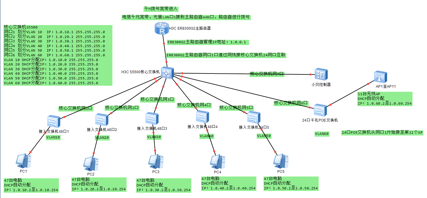 10、H3C S5500 网口6 划分VLAN60 IP:1.0.60.1 255.255.255.0 创建地址池:1.0.60.0 255.255.255.0 1.0.60.1 114.114.114.114