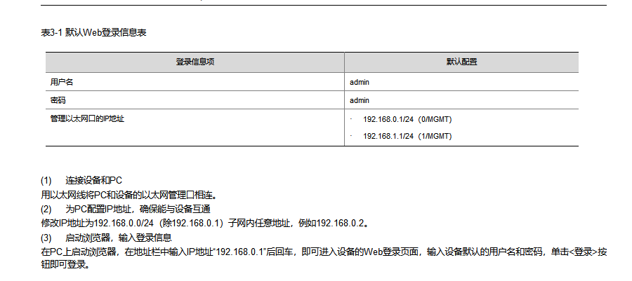 # 在PC的浏览器地址栏内输入设备的IP地址并回车,浏览器将显示Web登录页面。在“Web用户登录”对话框中输入用户名、密码及验证码,点击<登录>按钮后即可登录,显示Web初始页面。成功登录后,用户可以在配置区对设备进行相关配置。