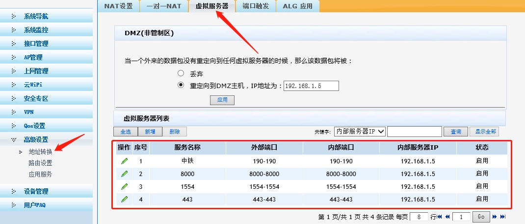 2、如果物理防火墙,检查其安全策略控制,放通190/8000/1554等端口到你目的地址192.168.1.5。