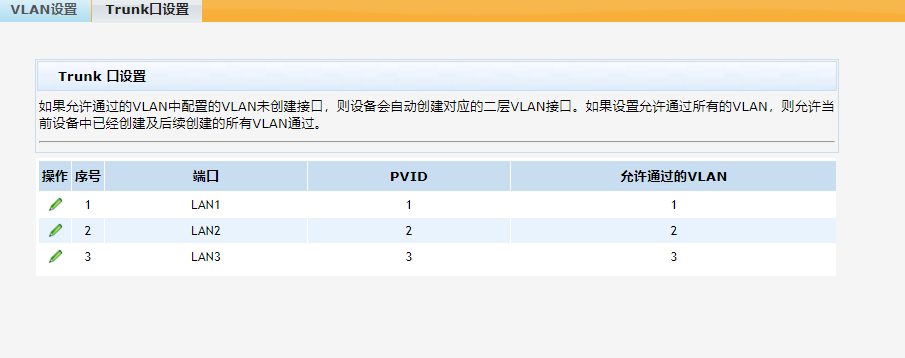 页面向导:接口管理→VLAN设置→Trunk口设置