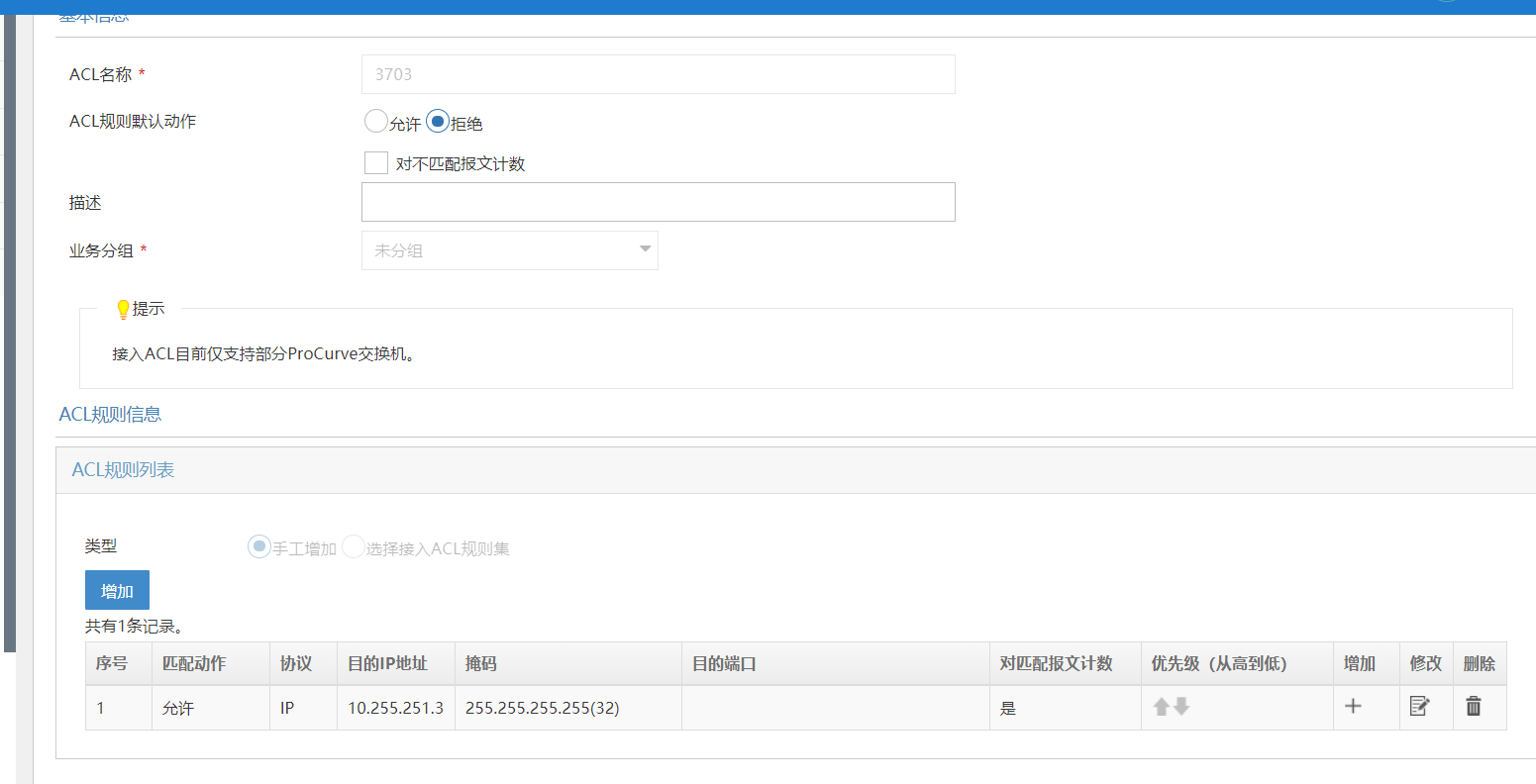 你看下配置acl的哪个提示,仅支持部分procurve交换机