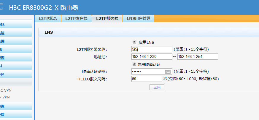 配置LNS信息(启用LNS,输入L2TP服务器名称:H3C-LNS,地址池:10.10.11.10~10.10.11.20,单击<应用>按钮生效) | |