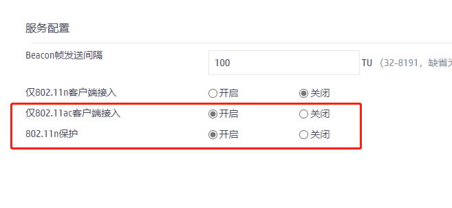 仅当射频模式为802.11n、802.11ac、802.11gac、802.11ax和802.11gax时才支持配置802.11n保护功能,切换射频模式为其它模式时, 802.11n保护功能的配置将被删除。