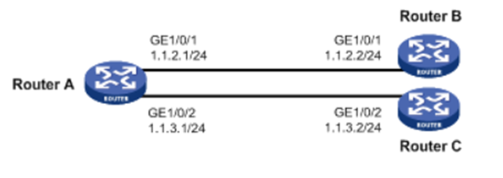 Router A分别与Router B和Router C直连(保证Router B和Router C之间路由完全不可达)。通过策略路由控制从Router A的以太网接口GigabitEthernet1/0/1接收的报文: