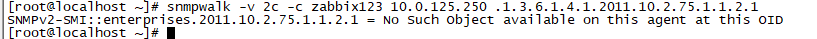 该问题前面已收到有用户名”Weijianing“发过来的链接,下载该PDF文件中引用到Linux的Zabbix服务器中,使用”snmpwalk -v 2c -c zabbix123 10.0.125.250 .1.3.6.1.4.1.2011.10.2.75.1.1.2.1“得到的结果如下: