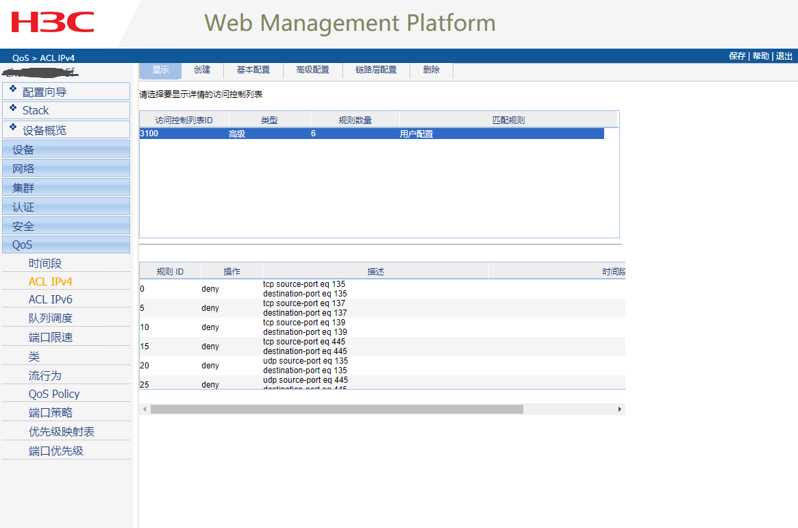 1、创建ACL,对高危端口进行拦截: