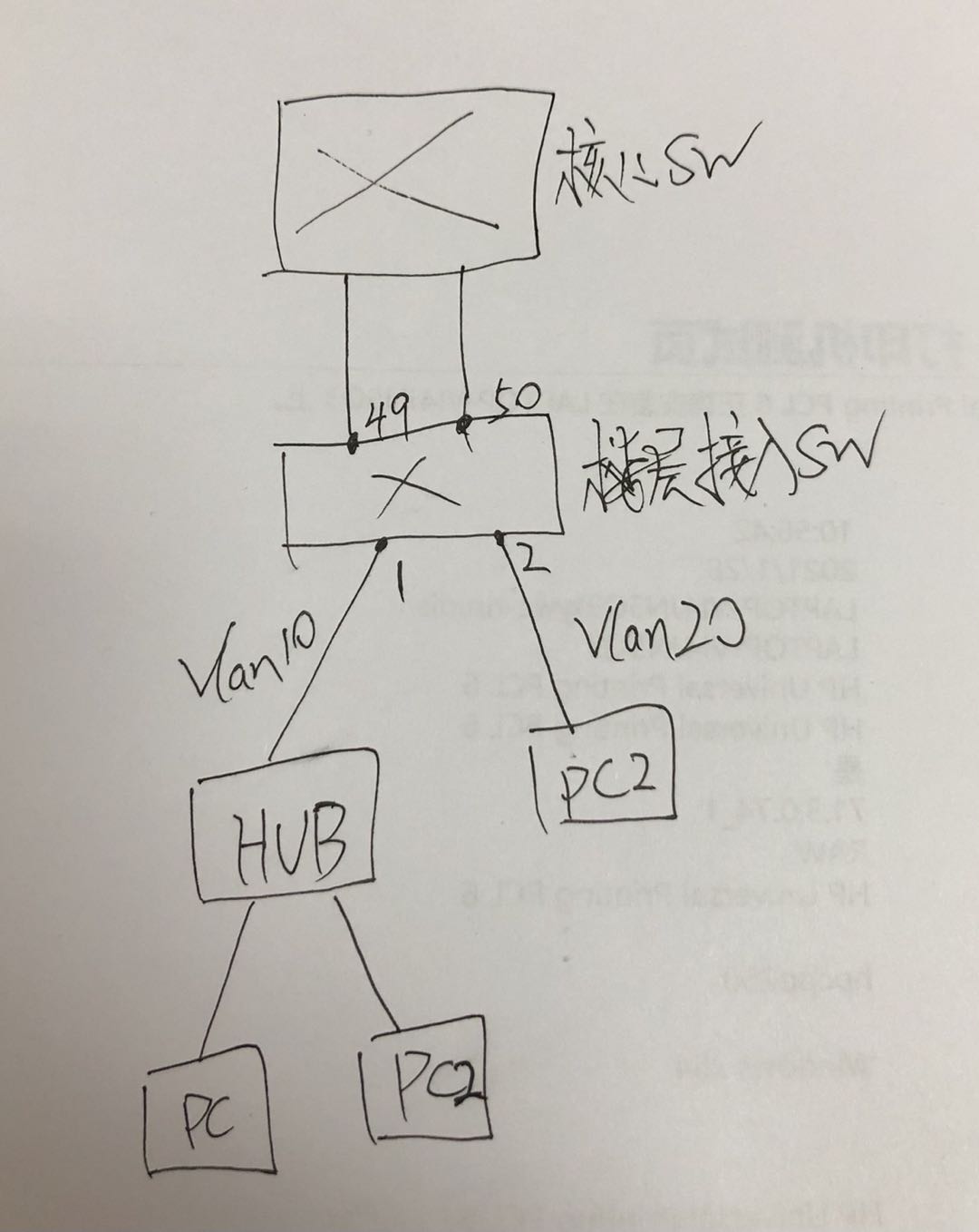 接入交换机只接了4根线,49和50口是光纤端口汇聚接入核心交换机,1口下面接了一个HUB,有一个特殊的地方是PC2是双网卡一个接了11口一个接了办公室HUB,但这两个是不同的Vlan,