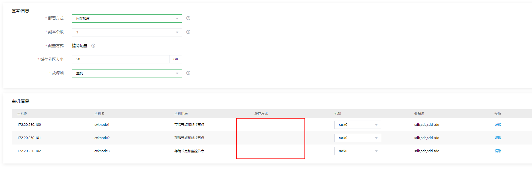 三台主机都能看到缓存盘的,sde哪块盘是ssd 其他三块都是hdd盘