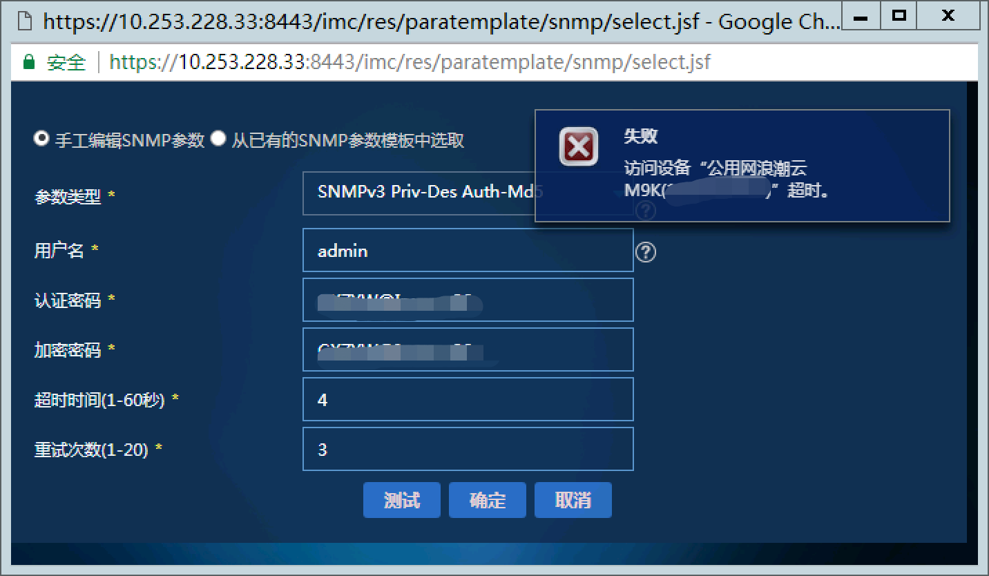 U-Center在纳管的一台设备之前是正常的,设备在进行一次重启后,UC上就显示未知状态,在删除设备重新添加时,设备就不能正常进行纳管,SNMp参数和SSh参数都是配置对的,但测试SNMP参数提升超时,UC能ping通设备,端口也没做限制,同样的配置在另一台设备能正常纳管获取信息。请教下还有什么排查方法