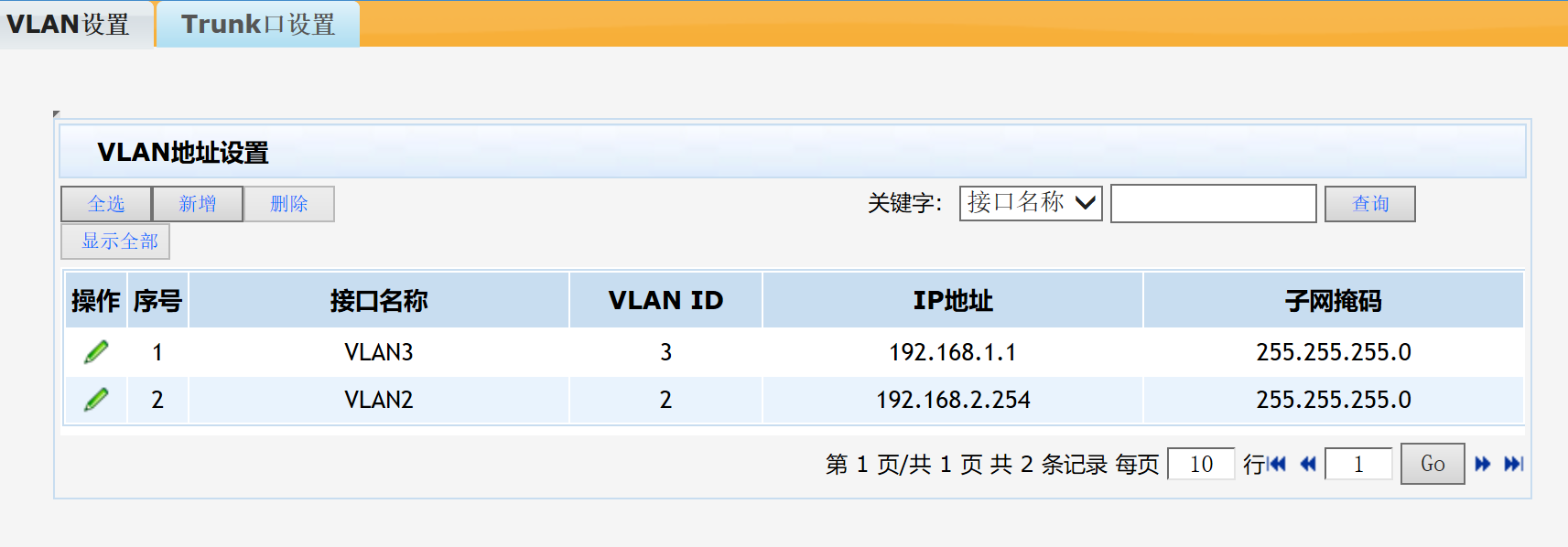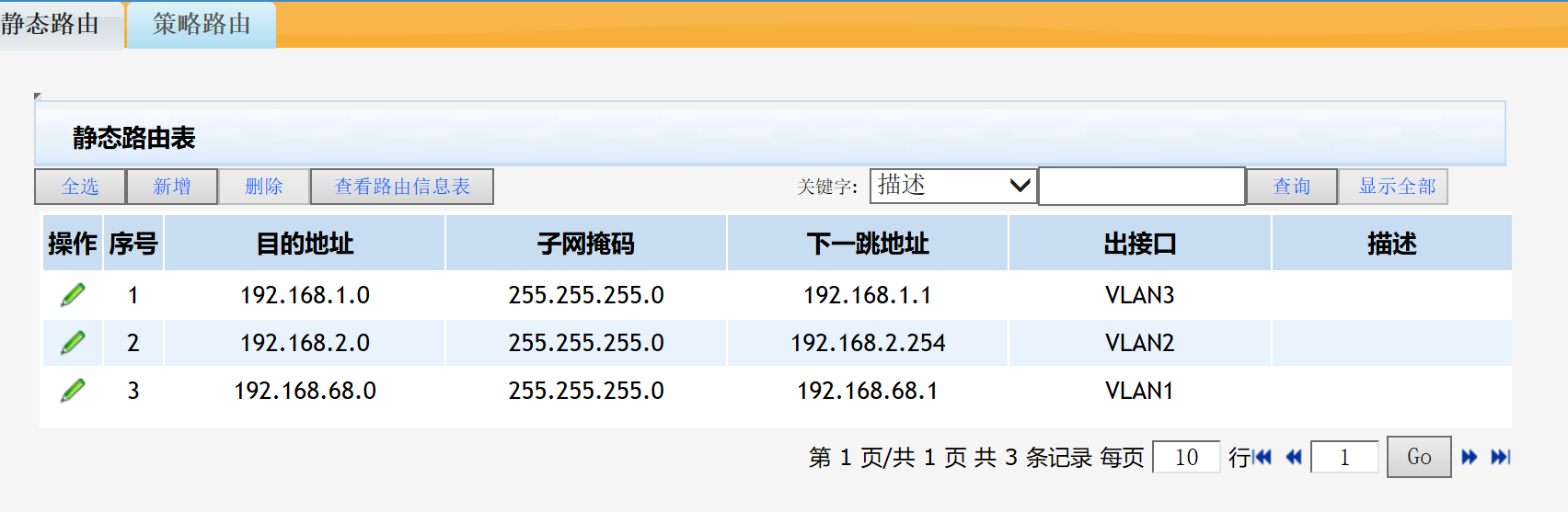 路由器设置了2个VLAN,加上默认的VLAN1,一共3个VLAN,我这边试过很多种连接方式都不能使三个VLAN之间自由访问。要不就VLAN1和VLAN3可以正常通讯,要不就VLAN2,和VLAN3可正常通讯。相关设置如下图