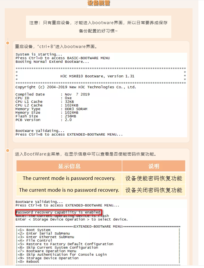 2、如果所有密码都忘记了,可通过重启,按下“ctrl+b”进入bootrom,选择跳过console密码选项进入设备后修改。