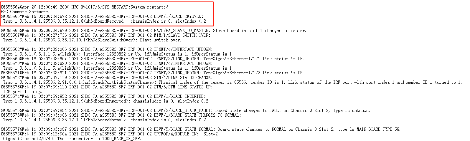 H3C S5558C V5.20 堆叠交换机原主交换机重启,日志提示如下,能从日志看出重启原因吗?电源没有问题,也没掉电;