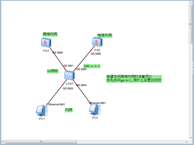 内网访问外网时走防火墙2的g0/0/0。内网访问59网段时走防火墙1的g0/0/0。怎么配置比较好呢?