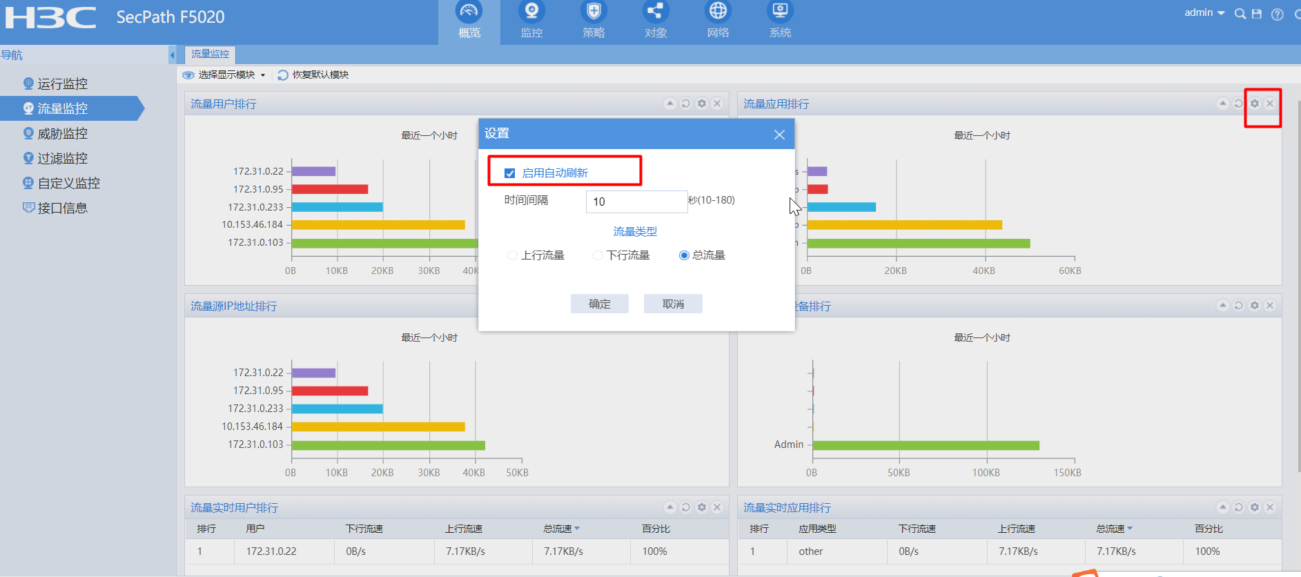 您好,需要开启 session statistics enable,然后将各个流量模块自动刷新开启,保存配置,等待一个统计周期后就会有流量统计图表显示。