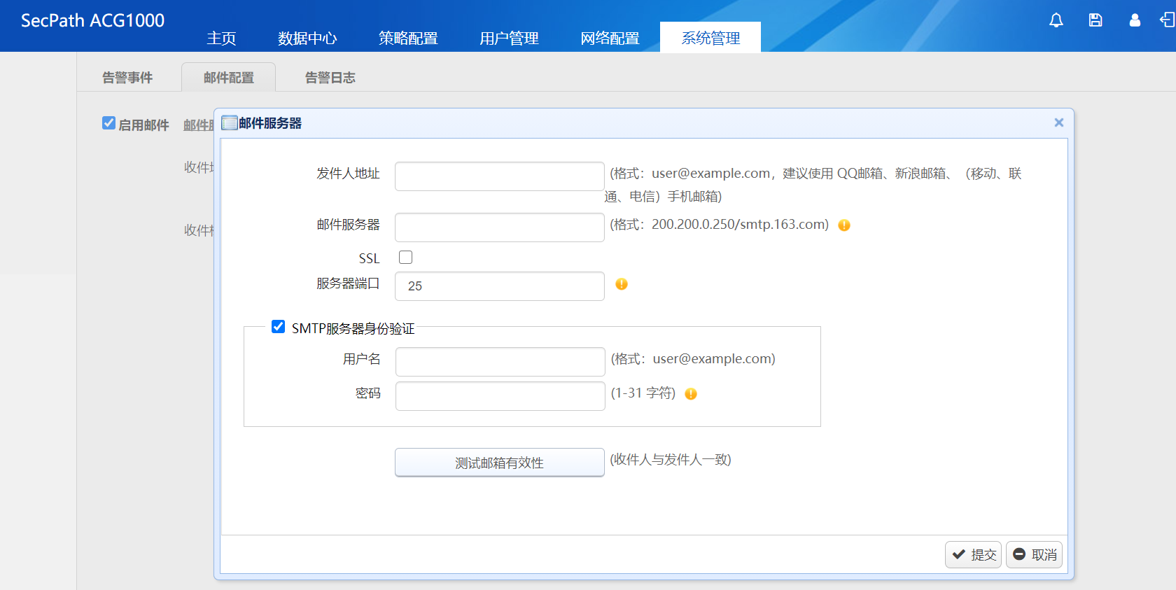 进入“系统管理>系统维护>系统告警>邮件配置”,如图3所示,配置邮件服务器。