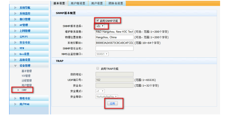 2) 在“基本设置”中勾选“启用SNMP功能”,版本选择V1或者v2c(这里以v2c)为例,其他的默认配置即可,然后点击页面下面的应用