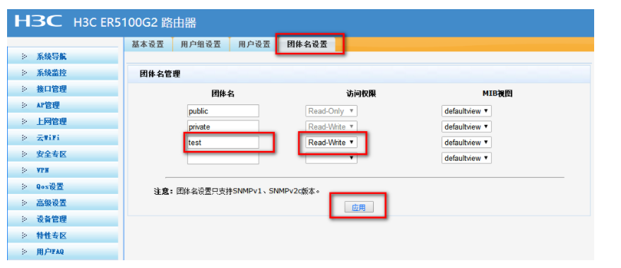 3) 在“团体名设置”中设置关键字,默认情况下存在“public”和“private”团体名,分别拥有“Read-Only”(只读),“Read-Write”(读写)的权限,使用默认的团体名“public”大部分的SNMP软件就可以读取设备信息,如果需要通过SNMP修改配置则要求团体名拥有“Read-Write”的访问权限(默认存在的“private”就可以),如果有需要可以自己创建一个新的团体名,这里以“test“为例,访问权限选择“Read-Write”MIB视图默认,然后点击“应用”