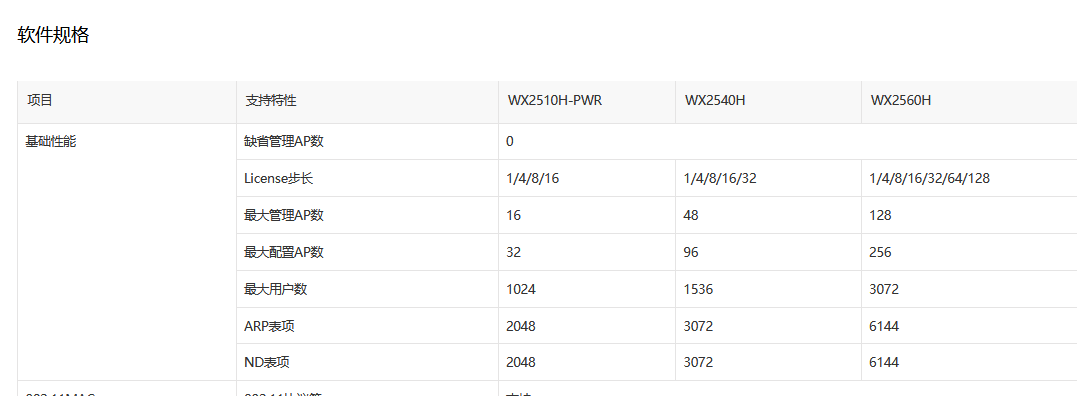 项目 | 支持特性 | WX2510H-PWR | WX2540H | WX2560H |