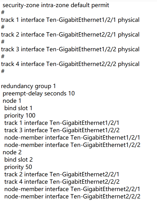 冗余组用来实现业务报文的接收、处理、发送都在同一台成员设备上进行 ,当主节点故障,主节点变为备节点,冗余组会同时禁用原主节点上的成员,让位于新主节点上的成员工作。