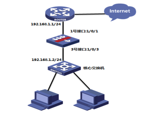 如下组网图所示,在原有的网络中增加防火墙来提高网络安全性,但又不想对原有网络配置进行改动,所以需要防火墙采用透明模式部署;其中GigabitEthernet 1/0/1接口接原有路由器的下联口,GigabitEthernet 1/0/3接口接原有的交换机上联口。