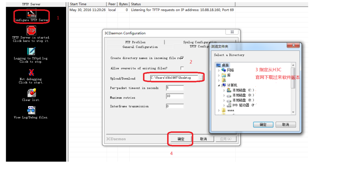 2、电脑通过网线连接到ap的一个网口,电脑网卡设置为:192.168.0.1 255.255.255.0,如下例子打开TFTP服务器,把bin软件版本放到电脑桌面上,TFTP服务器目录指向电脑桌面,然后点击确定。