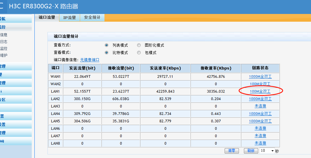 为什么显示100M全双工,我公司是200M,lan1接的主交换机是千兆机。
