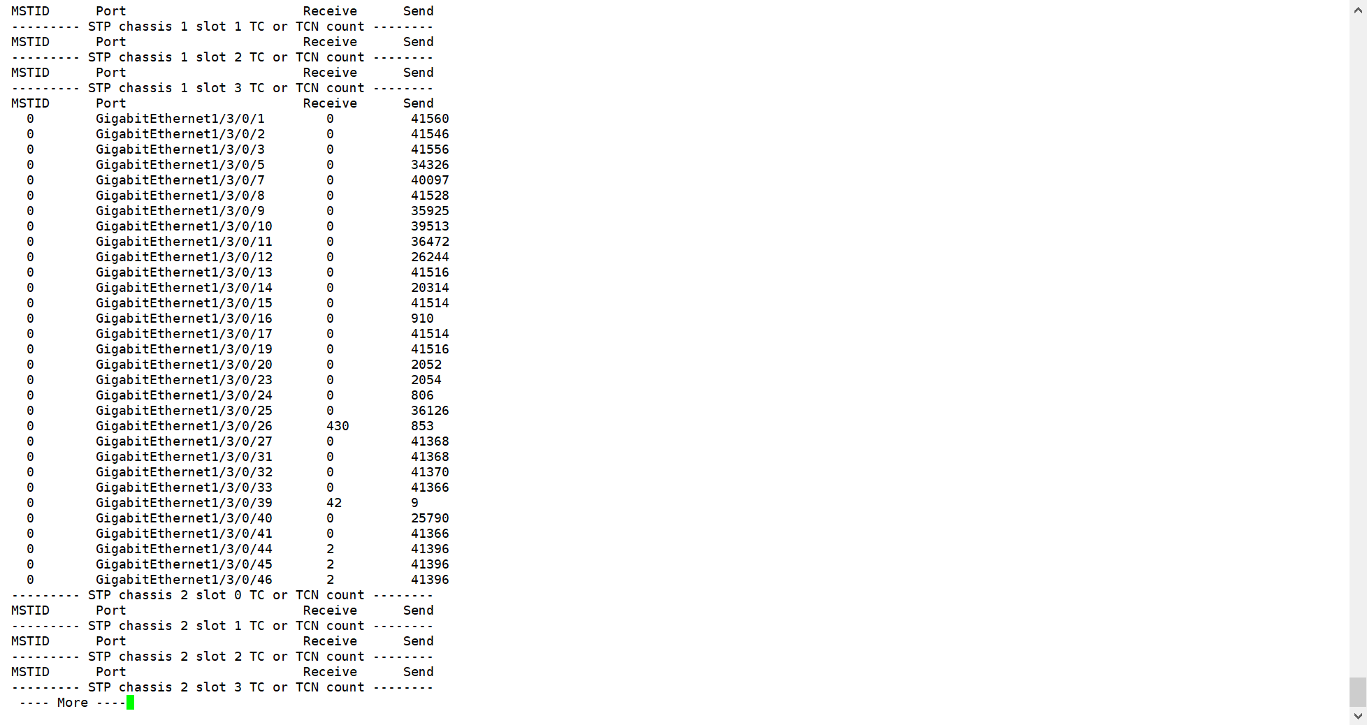 看一下26口和29口下面接的是什么设备,26口一直收到大量Tc报文,看一下26下面设备是否有问题
