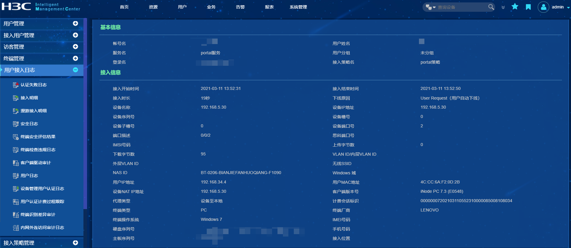 查看用户接入明细,发现192.168.34.4一直在上线下线,但在交换机中34.4是无法ping通的了和已经关机了的,而且当34.4电脑开机后,认证成功一会又自己掉线了,