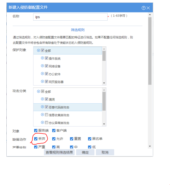 如下图 在配置策略或者调用的时候把丢弃动作全部取选中。别忘了日志相关全部开启。
