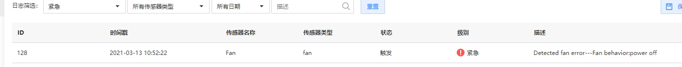 任意1个风扇失效时,其他风扇会加快转速,直至全速运行;同时前面板上的Health指示灯显示橙色闪烁(1Hz),提示系统出现严重告警。