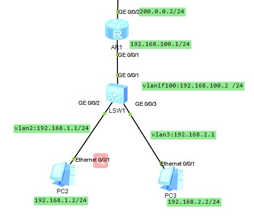 增加了没用,路由器:ip route-static 0.0.0.0 0.0.0.0 192.168.100.2 交换机:ip route-static 192.168.100.0 24 GigabitEthernet 0/0/1,加了这两条还是不能Ping通公网地址200.0.0.2