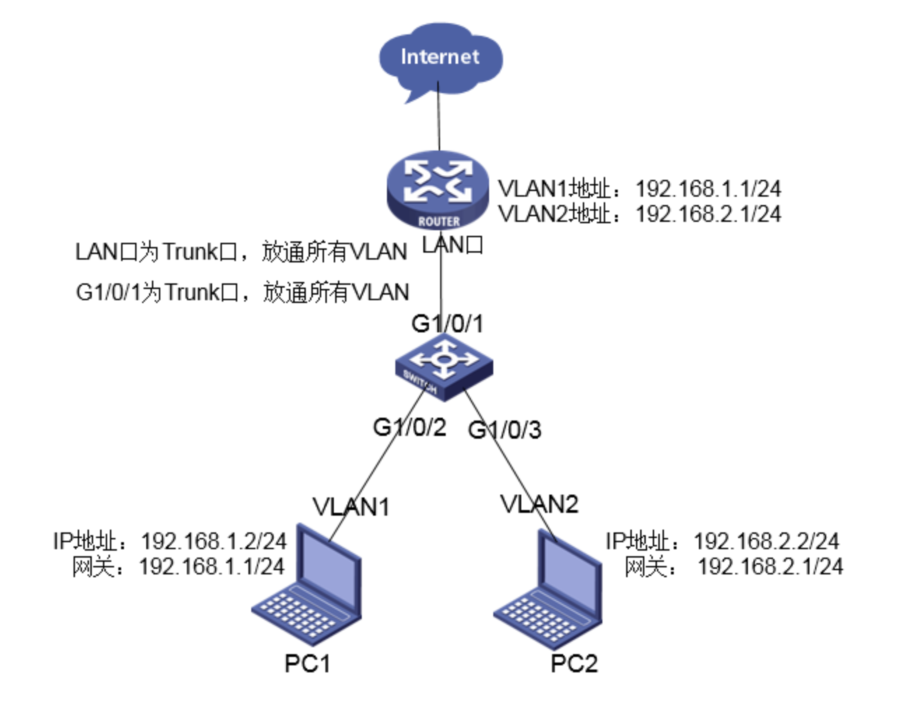 MSR路由器作为下面两个网段,192.168.1.0/24网段和192.168.2.0/24网段的网关。将路由器的G0/0口与交换机G1/0/1口相连,在路由器G0/0上创建虚地址;交换机与路由器的互连接口都配置成trunk口,并放通vlan2通过。交换机的G1/0/2接PC1,G1/0/3接PC2,要求PC1和PC2可以访问互联网(访问路由器的网关)。