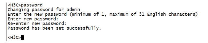 使用Consosle口登陆设备,参考【01设备管理】章节中的【1.1.1 Console方式登录设备方法】<H3C>提示进入设备命令行,输入password命令并回车,按照系统提示,提示:enter new password(输入新密码),则可以直接输入新密码,并重新输入一次确认即可。