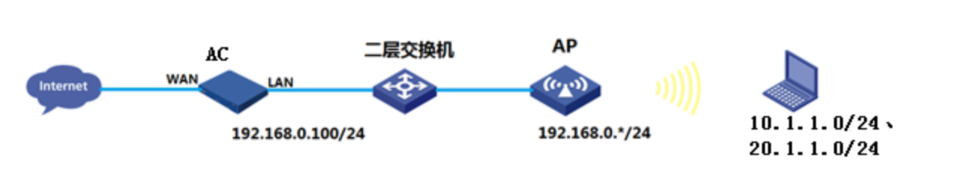 1、AC和AP通过二层交换机相连,AC的1口和交换机1口互连,AP接在交换机的2口。Vlan1为AP管理vlan,网段为192.168.0.0/24,使用二层自动注册。AC作为DHCP服务器。