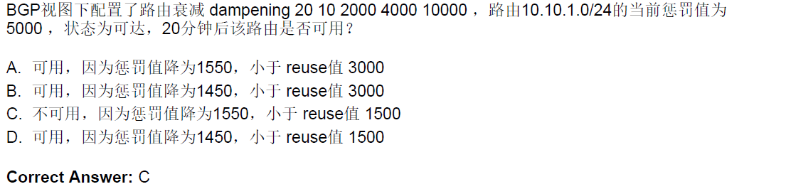 这题的答案为啥是C项啊,根据题目的意思,20min后路由的惩罚值减一半那么惩罚值不应该降为2500吗,不明题目中的数据是怎么算出来的,请大佬们指点一二