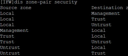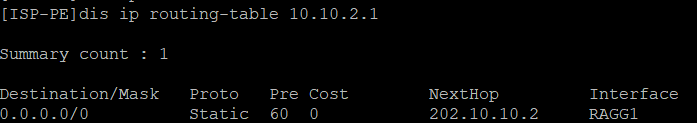 [IFW]display session table ipv4 verbose Slot 1: Total sessions found: 0 Slot 2: Initiator: Source IP/port: 202.10.10.1/306 Destination IP/port: 10.10.2.1/2048 DS-Lite tunnel peer: - VPN instance/VLAN ID/Inline ID: -/-/- Protocol: ICMP(1) Inbound interface: Route-Aggregation2 Source security zone: Untrust Responder: Source IP/port: 10.10.2.1/306 Destination IP/port: 202.10.10.1/0 DS-Lite tunnel peer: - VPN instance/VLAN ID/Inline ID: -/-/- Protocol: ICMP(1) Inbound interface: Route-Aggregation1 Source security zone: Trust State: ICMP_REQUEST Application: ICMP Rule ID: 0 Rule name: Start time: 2021-03-23 14:46:21 TTL: 59s Initiator->Responder: 0 packets 0 bytes Responder->Initiator: 0 packets 0 bytes Total sessions found: 1