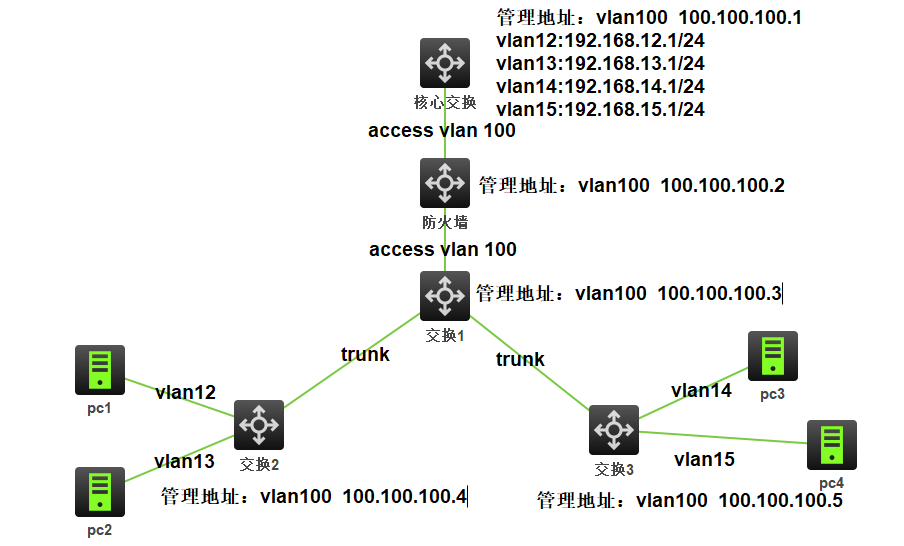 但是你的交换机1需要与防火墙与核心之间要跑trunk