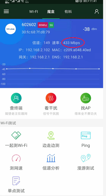 这是我自己家里的手机和wifi连接速率433M ,现场那边这个连接速率30M这样 还有更低 5G信号有 2.4G信号反而找不着 我不知道是不是哪里没设置好