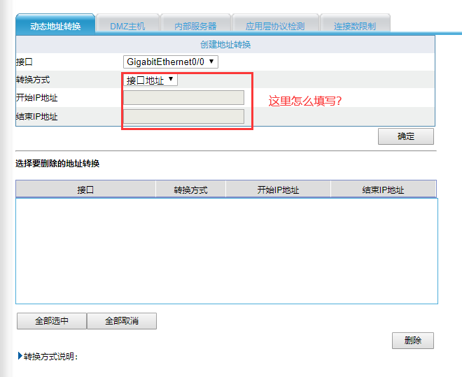 1 | 二者必选其一 按照内部网络与外部网络间地址映射关系的产生方式,可以将地址转换分为动态地址转换和静态地址转换两类: · 动态地址转换:外部网络和内部网络间的地址映射关系由报文动态决定。适用于内部网络有大量用户需要访问外部网络的需求 · 静态地址转换:外部网络和内部网络间的地址映射关系在配置中确定。Web页面支持DMZ主机配置 | |