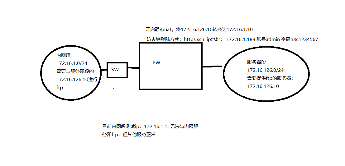 请问下这种拓扑,访问都正常,防火墙策率也放的,防火墙开了nat alg ftp也还不行,请问有遇到过这种情况的嘛