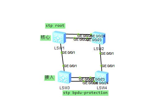 但是,边缘端口收到BPDU报文会失去其边缘端口属性。为防止攻击者仿造BPDU报文导致边缘端口属性变成非边缘端口,可通过执行命令stp bpdu-protection配置交换设备的BPDU保护功能。