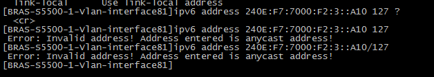 刚客户的交换机S5500交换机上配置interface-vlan 的IPV6地址,提示:address entered is anycast address