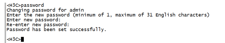 使用Consosle口登陆设备,参考【01设备管理】章节中的【1.1.1 Console方式登录设备方法】<H3C>提示进入设备命令行,输入password命令并回车,按照系统提示,提示:enter new password(输入新密码),则可以直接输入新密码,并重新输入一次确认即可。