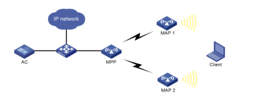 该案例中AC为WX2540H,MPP为WA5320-C-EI负责连接无线Mesh网络和非Mesh网络,MAP为WA5530同时提供Mesh服务和接入服务。