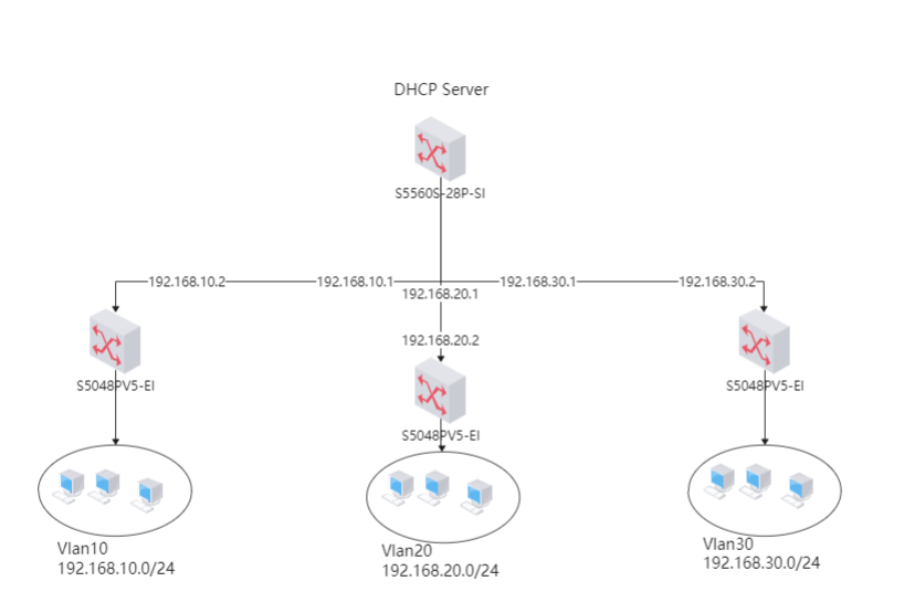 想S5560S-28P-SI做DHCP给下面的三台S5048PV5-EI接入的三个vlan分配IP。想问下怎么配DHCP中继。目前DHCP地址池没有分配网关,下级的S5048交换机就创建一个对应的vlan然后所有端口划分到对应vlan使用的静态路由“0.0.0.0 0.0.0.0 X.X.X.X”下一跳使用图中标注的上层对应vlan的IP进行转发这样是否可行。