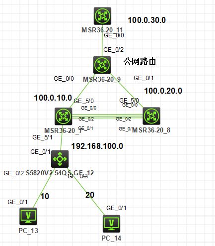 模拟场景:下面两台路由器堆叠,模拟是一个私网的出口路由器。写两条默认路由指向公网,优先级不一样。下一跳到100.0.20.1优先级更高。