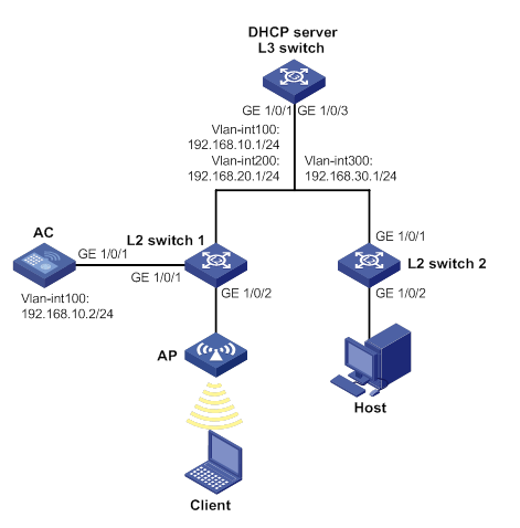 · 无线客户端Client通过VLAN 200接入网络,有线客户端Host通过VLAN 300接入网络;