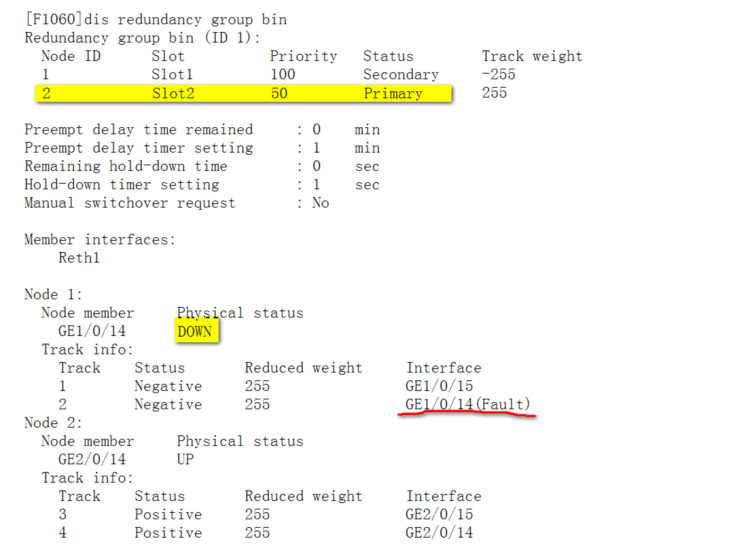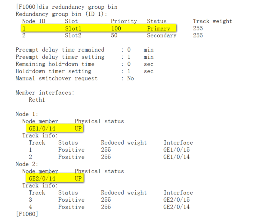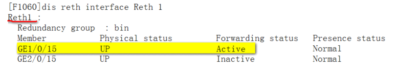 显示Reth信息。可以看到Reth1中优先级高的成员接口处于激活状态。