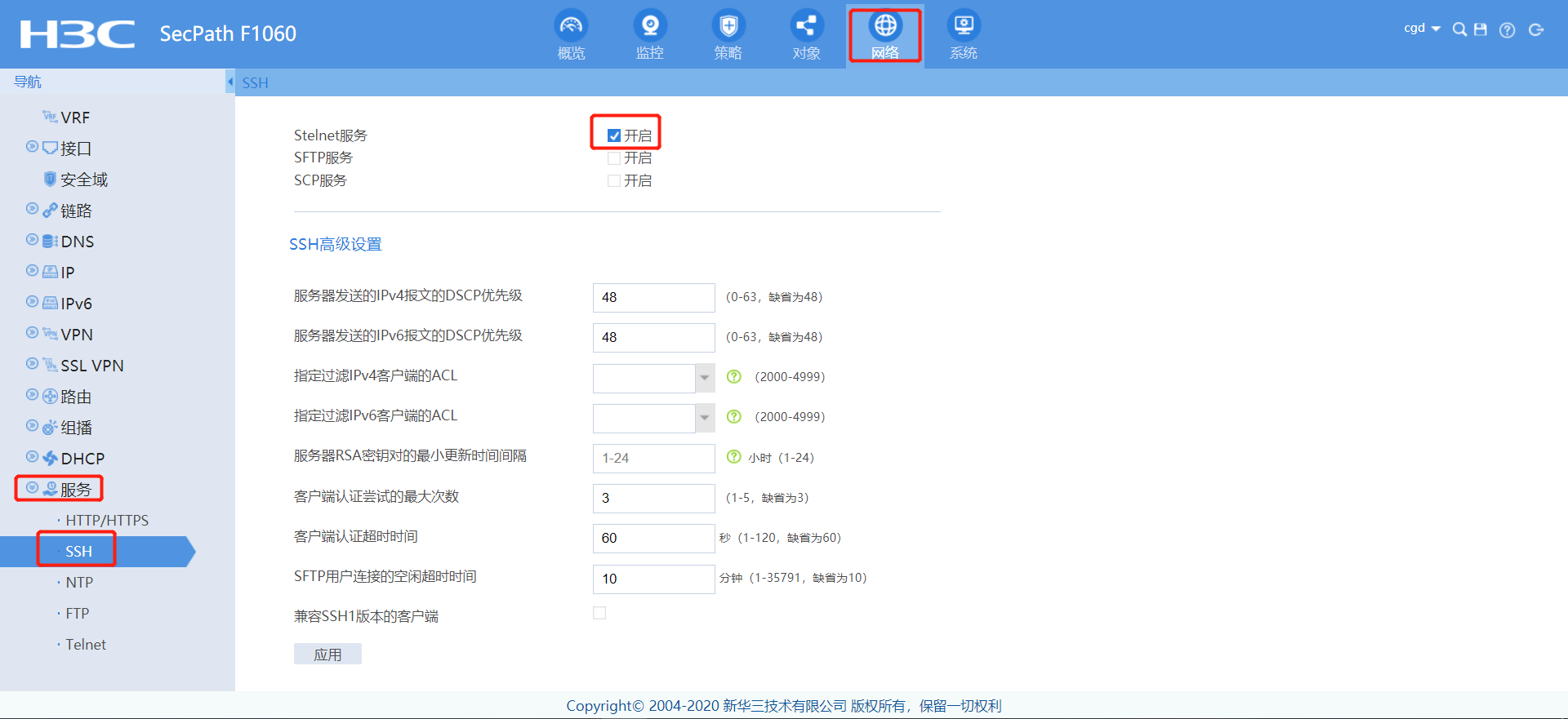 # 创建本地账号abc,密码为123456,权限级别为network-admin。//如果现场同一个本地用户既需要通过ssh登录,又需要console登录,则服务器类型需要添加 terminal