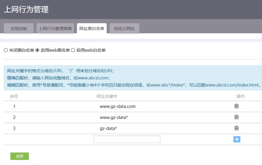 上网行为管理中启用web黑名单,然后添加网址:***.***, www.gz-data*, gz-data*(已点击应用按钮)